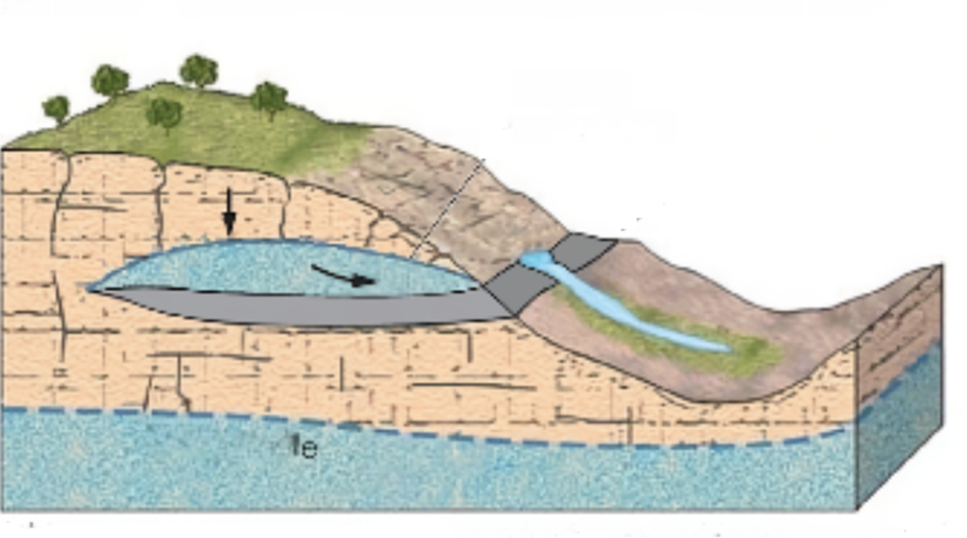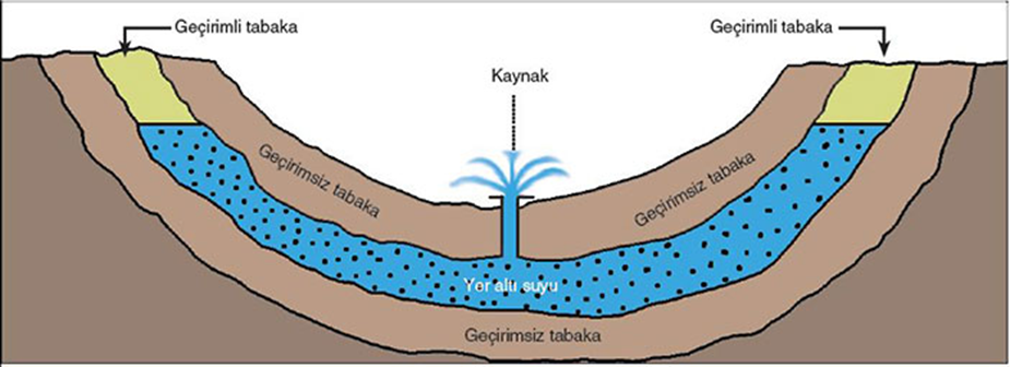 - Tutuklu akifer (artezyen): Geçirimsiz tabakalar arasında basınçlı su; kırık ve faylar boyunca ya da kuyularla fışkırarak yüzeye çıkar.